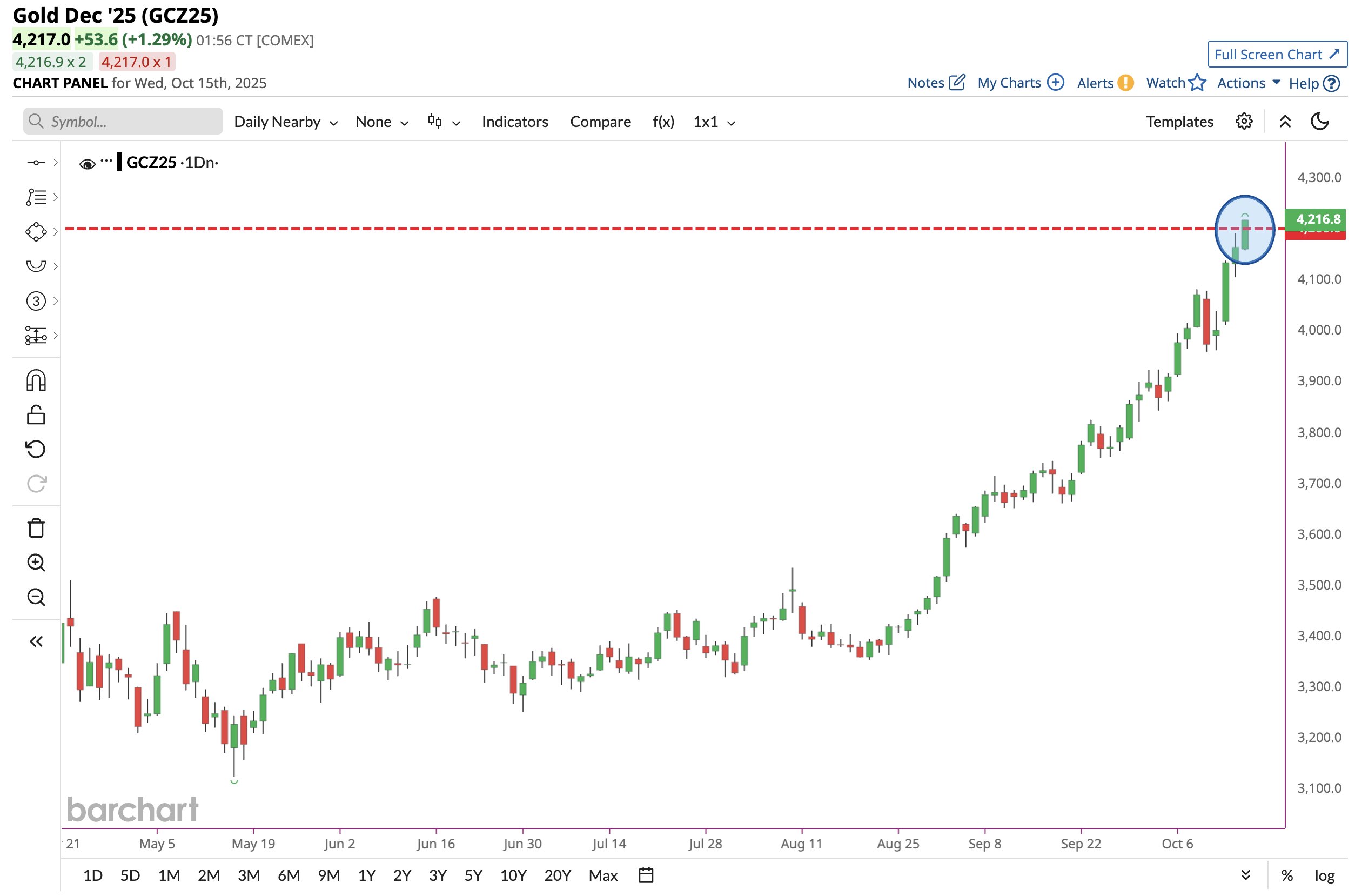 আগের সব রেকর্ড ভেঙে প্রথমবারের মতো বিশ্ববাজারে প্রতি আউন্স সোনার দাম ৪ হাজার ২০০ ডলার ছাড়িয়েছে। বুধবার (১৫ অক্টোবর) নতুন মাইলফলক স্পর্শ করে এই সোনালী ধাতু।